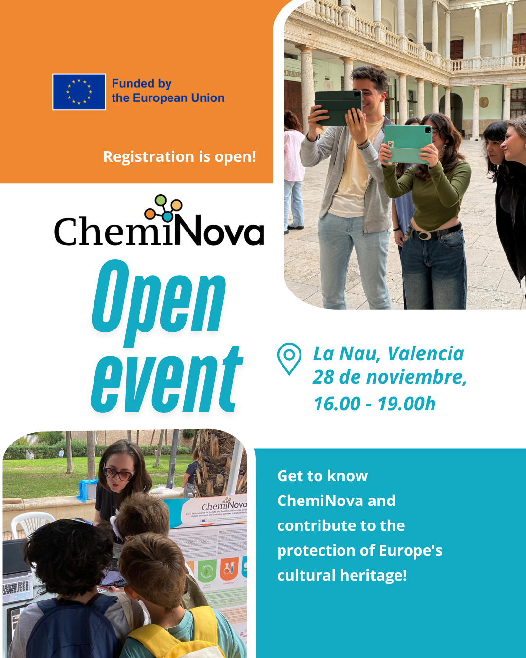 The ChemiNova Open Event aims to engage the public in a special afternoon to showcase how innovative science and culture can work together to protect Europe’s cultural heritage from the impacts of climate change and civil conflicts. The event is designed to introduce the ChemiNova project’s goals and tools through interactive, hands-on activities.